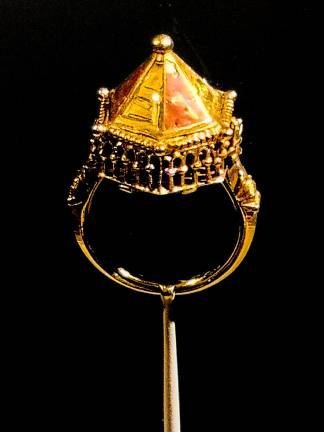 Buried in a wall in a confectioner's shop in a picturesque town in the Alsace region of France, and uncovered by workmen in 1863, this bundle of valuables was hidden by members of the Jewish community in the early 1300s. There were rings, coins, a silver studded belt and headband, buckles, silver cups, an extravagant brooch, and one rare and spectacular wedding ring. Shaped like a roofed building, meant to recall the Temple in Jerusalem, and inscribed with the Hebrew words, "Mazel Tov," or good luck, it's part of what identified the owners as Jewish.