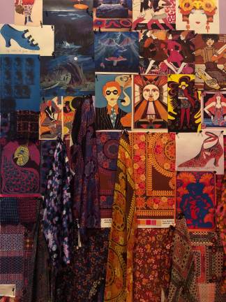 Fabric swatches, sequins, trims, a copy of Warhol’s silkscreen Marilyn, color charts, print samples, psychedelic illustrations, and more adorn the boards. Her interests are “all-encompassing,” according to the wall text – there is no limit.
