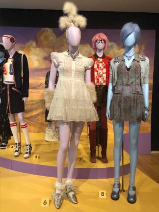 As she once said, “I’m always looking for the unfamiliar perspective on familiar things. That takes research, which is my favorite thing.” One of the most revealing parts of this exhibit is the display of her studio’s “mood boards” for the Fall 2019 “Poptimistic” collection—that place where she hashes out ideas and we see the products of her research, the things in the culture and in history that move her, like art, interior design, fashion, film, youth and rock ‘n’ roll.