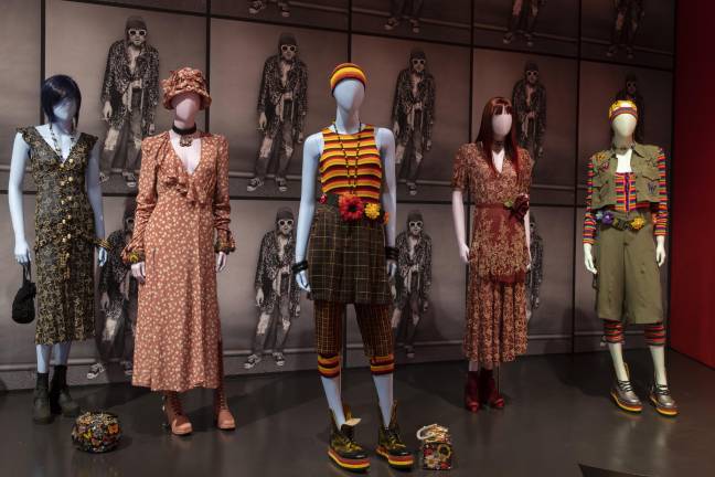 The all-out, brilliantly colored ensembles are arranged according to 12 “archetypes.” These are the themes that have inspired Sui’s fashion collections, interiors, licensed products and accessories. Think Mod, Androgyny, Retro, Surfer, Americana, Schoolgirl, Punk, Hippie & Rockstar, Grunge, Victorian, Fairytale and Nomad, the latter a nod to the many cross-cultural references in her clothing.