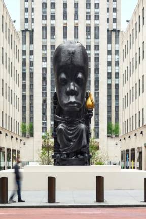 Through June 29th, “Oracle,” a two-story tall, 15,000 pound bronze sculpture by Sanford Biggers towers over Rockefeller Center’s Channel Garden off Fifth Avenue. It was commissioned by the non-profit Art Production Fund and presented by them along with Rockefeller Center and Marianne Boesky Gallery, and it’s the centerpiece of a campus-wide exhibition that brings murals, flags, film, photographs, paintings and sculptures by Biggers to several locations in Rockefeller Center. “I’ve always been intrigued by Rockefeller Center for its architectural history and mythological references,” the artist noted in a statement, adding, “Rockefeller Center is an ideal context for myth creation.” Incorporating abstraction and realism, traditional and new media, African and European styles and imagery, Biggers presents new thoughts on histories, myths and power.