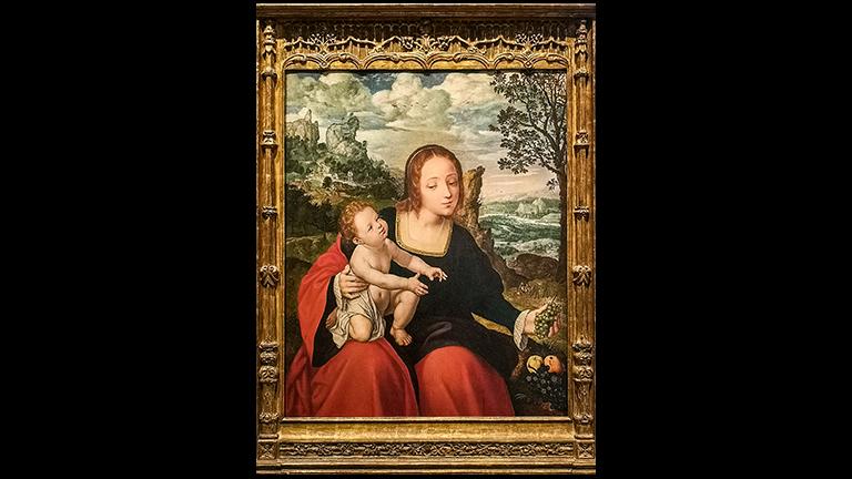 The painting, "The Rest on the Flight to Egypt" was created by two Flemish artists, one an expert in landscape, the other known for figures. It's a large panel, with a carefully modeled representation of Mary and Jesus, richly attired in sumptuous colors, trimmed with gold and jewels. A still life is included – a bowl of grapes and fruits – and the scene takes place within a crowded landscape filled with trees, mountains and fluffy clouds. It's a beautiful painting that once belonged to a German baron. A visitor nearby wondered aloud, "Only five cows?"