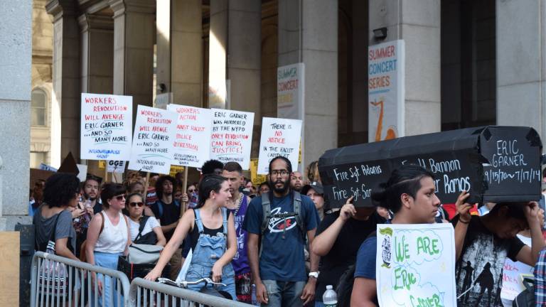 Speakers at the protest pointed out that since Garner’s death, Pantaleo has been placed on desk duty but has continued to receive pay and pension benefits. Police commissioner James O’Neil will ultimately decide what disciplinary action Pantaleo faces,