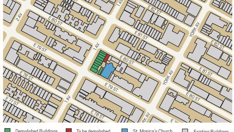 At issue is a vast construction site where Extell Development Co. this summer razed nine humble four-story buildings. Each had a footprint of roughly 2,000 square feet, and together they housed 11 retailers and 104 apartments abutting historic St. Monica’s Roman Catholic Church on East 79th Street.