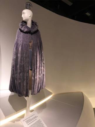 Gallenga, known for exquisite fabrics that reference the past, created a lavender silk velvet cape (ca. 1925) that is printed with metallic pigment in a pattern adapted from a 14th century Italian textile. Said the curator: “It has this really wonderful glistening effect that imitates the appearance of brocaded velvets from the Renaissance period.”