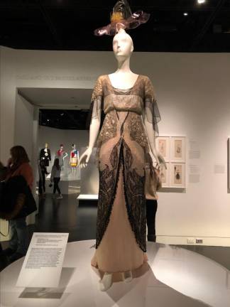 Maison Margaine-Lacroix (active ca. 1889-1929) eschewed “extreme corsetry” to allow freer movement and display of a woman’s figure. One of the standouts here is Jeanne Victorine Margaine-Lacroix’s pink silk satin gown (ca. 1913), with metallic lace, silk net, black beading and iridescent sequins. It shows the move toward a more natural form and the “exceptional beading and lacework that is typical of the period and reflects the skill of this house,” Regan said.