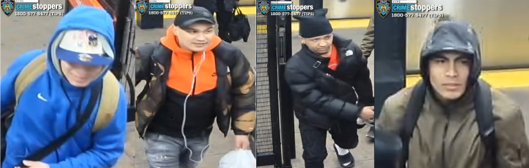 The fourth sought individual is described as “a male with a light complexion. He was last seen wearing a brown jacket, a black hooded sweatshirt, black pants and black sneakers and carrying a black gym bag.”