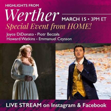It was excerpts of Jules Massenet’s gorgeous "Werther," which was to have opened at the Metropolitan Opera Monday night, sung by the two leads, Joyce DiDonato and Piotr Beczala, in the living room of her Manhattan apartment. She was barefoot, he wore a suit but no tie. Pianist Howard Watkins and harpist Emmanuel Ceysson accompanied them.