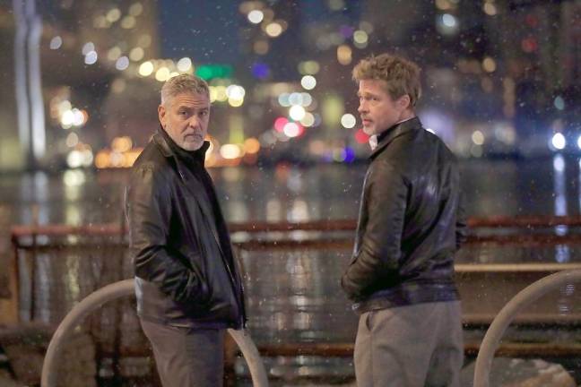 Long time plays George Clooney (left) and Brad Pitt, who are starring in Wolves, a new thriller for Apple Original Films, captured while filming at the South Street Seaport. Photo: Steve Sands/New York Newswire (