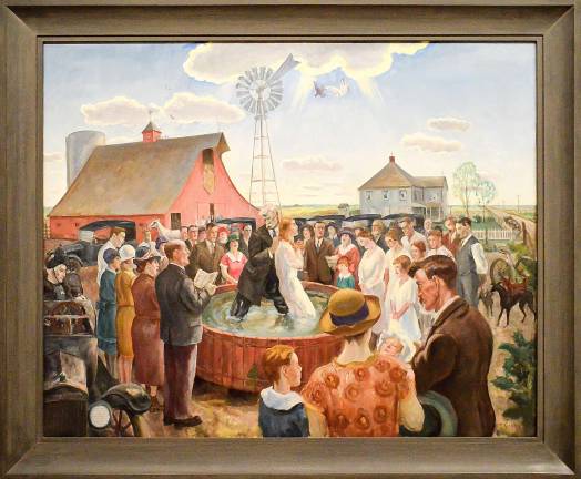 Some of the most beautiful and touching images in the exhibition are in the section titled “No One Exists Alone.” Along with the Gorky and Porter images, there are John Steuart Curry’s paintings that evoke the serious yet joyful rural communities of his youth. Paul Cadmus and PaJaMa (the collective name used by Cadmus, Jared French, and Margaret French) are included with works that, the wall text states, “give visibility to queer relationships that continue, in our time, to demonstrate the commonality of love and to enrich our understanding of what family and community mean.” A stunning group portrait in rich tones of sienna and cobalt, Charles Henry Alston’s “The Family” pulls you from across the room in a room filled with great paintings. Its monumentality, quietude and grace imbue the subjects with as much dignity as was ever painted into a royal portrait by Velázquez or Rubens.