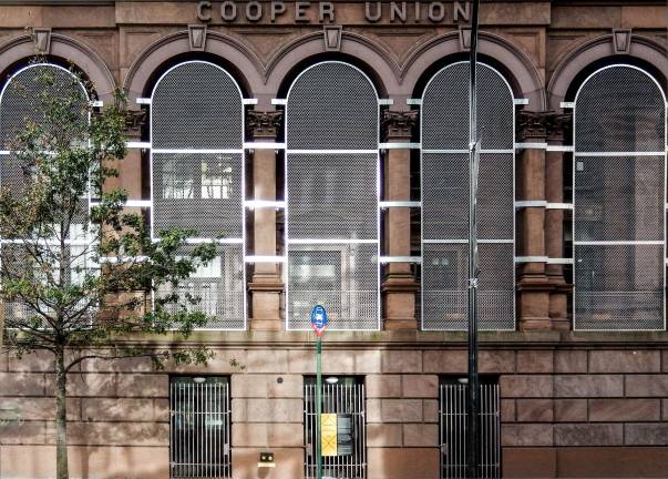 The tall, arched windows on the façade of the original Cooper Union building, one of the oldest institutions of higher education in the country, are clamped with steel bars and chain link fencing. What does that work, “Five Fences,” say about freedom of thought, freedom of speech, or the desire to further, or stifle, knowledge?
