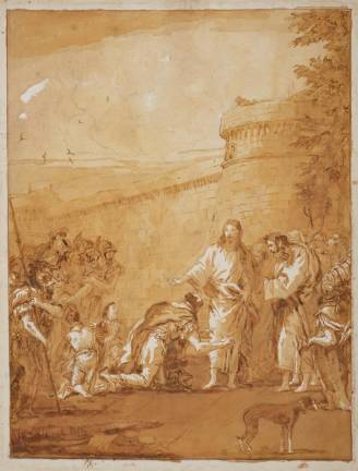 For instance, in Tiepolo’s “Christ and the Centurion of Capernaum,” you can see him working out the dynamics of his cinematic approach to composition – where to place the angels and soldiers, the horizon, the postures of Christ and the centurion.