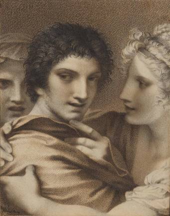 One aspect of this exhibit is the predominance of portraits that beautifully, even poignantly, illustrate subtle distinctions in human nature. Fragonard’s “La Coquette,” a fashionable young woman executed in red chalk, has a posture and attitude recognizable to any parent of a teen age girl. In “Reason Speaks, Pleasure Entraps,” Pierre-Paul Prud’hon shows a handsome youth deciding between a smiling gorgeous blonde embracing him while a sterner looking woman whispers a warning in his ear. The youth, in the middle, fingers on his chin, ponders which way to go. It’s a witty and well-crafted take on an ancient trope, the Choice of Hercules – the choice between virtue and vice.