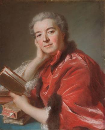 The best of the portraits is the pastel work by Maurice-Quentin de La Tour, of Anne-Marguerite Perrinet de Longuefin, Mme. Rouillé. She’s an older woman wearing a sumptuous velvet robe trimmed in frothy lace (how does he do that with chalk?) sitting amid a pile of books. She radiates warmth and intelligence. She was interrupted in her reading (her finger holds her place) but she looks at the viewer with gentle forbearance.