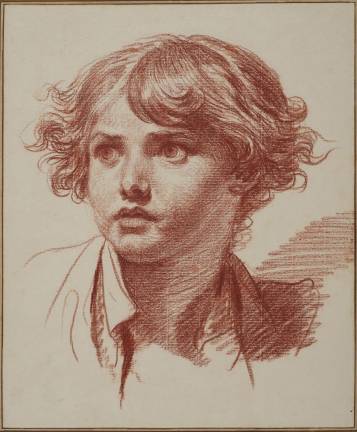 Or the artist does a practice run on individual elements of a larger work. Jean-Baptiste Greuze’s arresting “Head of a Boy” is a dramatic red chalk rendering of a lad wide-eyed in fear, consternation, and alarm – but it’s not just any boy. His face appears in Greuze’s famous “A Father’s Curse” as the young son cowering in a crowded scene.