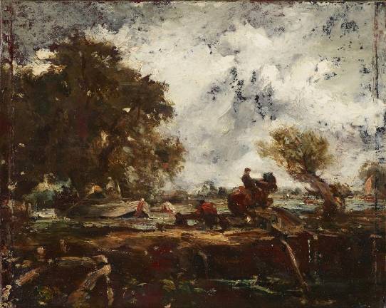 Still other works are shorthand studies for a future work. Constable is famous for huge canvases of detailed countryside scenes, but his Study of a scene for “The Leaping Horse” is an impressionistic rendering of sky and scenery painted outside, as reference guide for studio work. Emil Carlsen used the same technique, visible at the Salmagundi show that closed on Sept. 30.
