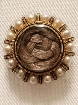 Jewelry made from or encasing human hair may seem odd, but it's long been common to tuck a curl into a locket. A pair of earring from the 1880s, with gold beads giving way to dark, woven drops, looks unspectacular until you read the label and find that the dangles are made of extremely thin braids of human hair. An 1868 Tiffany & Co. brooch carries plaited auburn hair behind a crystal, surrounded by gold and pearls. Only a bit of hair remains of the woman, along with her name engraved on the back, Cornelia Ray Hamilton. Despite date with death it implies, it's elegant and appealing, even to today's eyes.