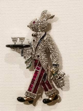 "American Industry," "Fin de Siècle Brilliance," and "Nature and History as Inspiration" trace changing tastes, including a madness for diamonds spurred by discoveries of mines in South Africa in the second half of the 19th century, and by the rise of luxury manufacturers like Tiffany & Co., Cartier, Dreicer & Co., E. M. Gattle, Verdura, David Webb, and Raymond Yard. Sleek Art Deco styles started to replace traditional forms. One of the most charming pieces, filled with whimsy and sparkle, was designed by Raymond Yard in about 1930. It's a rabbit made of gold, diamonds, rubies and sapphires, carrying a tray of martinis – a declaration of fun and a political statement made right in the middle of the prohibition era.