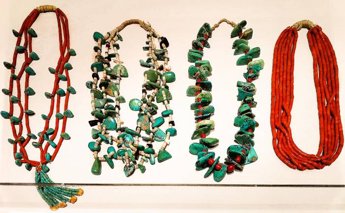 One of the most moving displays in the exhibition is a case of Zuni beadwork. Necklaces of coral and turquoise from the early 20th century evoke natural and spiritual world views. One can almost feel the energy coming off of them. The collection once belonged to Henry Chee Dodge, a chief of the Navajo Nation, whose photograph hangs above it. The museum does well carrying forward a policy of including Native American art in the galleries and exhibitions in the American wing.