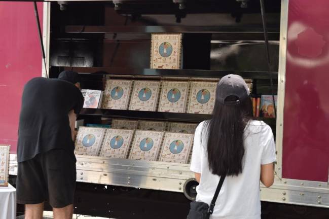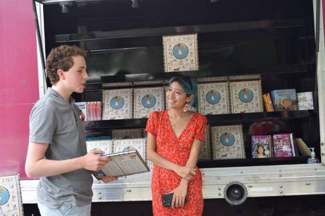 House of SpeakEasy brought its Bookmobile of free books to Bella Abzug Park, along with 17-year-old Michael Hoffen, who discussed his new book “Be a Scribe.”
