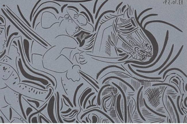 The exuberant “Summer” by Robert Blackburn, a color lithograph on cream woven paper, pops with bright cheerful color that suggest sunshine, a sandy beach and cool clear water. Asking Yahner to pick his favorite is like picking a favorite child, but he cites two Picassos: a very rare print of Picasso’s Salome from 1905 and Picador, a work on loan from the John Szoke Gallery, NYC. The picador was a favorite subject of Picasso’s, since his father often took him to bullfights–in fact, his first painting, made when he was eight, is of a picador he saw at a bullfight with his father.