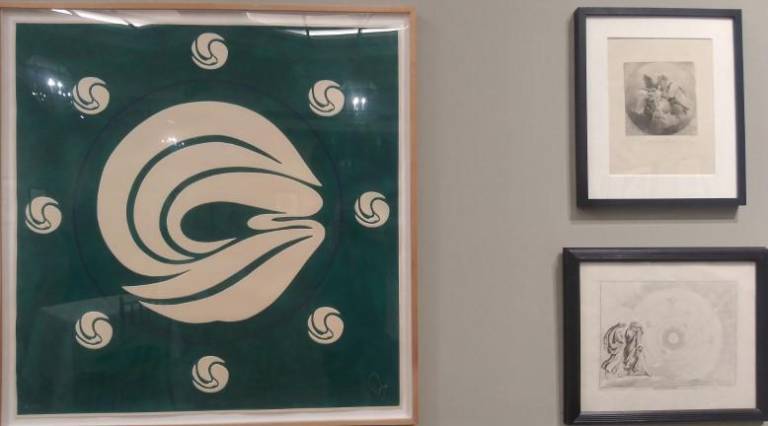 A careful observer will see themes in the arrangements on the walls. On the far wall, for example, a large, vibrant Mandala Green by Jack Youngerman dominates the space. Next to it is an engraving based on Tiepolo’s Venus and Time, made for L’Arte, a famous arts journal of the late 19th century. Beneath it is a line engraving of a Canto of Dante’s Paradiso, with Beatrice showing the poet the various circles of heaven by Bartolomeo Pinelli. “All three have a spherical motif – all based on circles,” Yahner points out. “...and they each have a spiritual theme–the Mandala representing the East, the Tiepolo engraving representing Classic Western mythology, and the Divine comedy image representing Christian imagery.” At the other end of the hall more contemporary artists cover the waterfront from realism to expressionism.