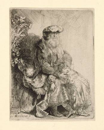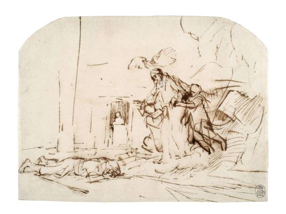 The painting is surrounded by a tight selection of other Rembrandt scenes from the life of Abraham. Exquisite drawings, executed in sparse but powerful strokes, and etchings in which the lines vary from dark and strong to whispers that look traced by a feather, depict other notable biblical tales, and include “Sacrifice Of Isaac,” “Abraham Caressing Isaac,” “God Announcing his Covenant with Abraham,” “Abraham Casting Out Hagar and Ishmael,” and a touching father-son moment between Abraham and Isaac.