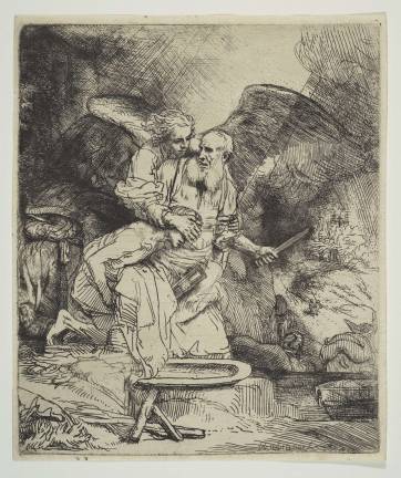Though Rembrandt never traveled abroad, he voraciously consumed imagery from afar and was influenced by Caravaggio’s chiaroscuro, as well as by the Baroque model of focusing on action and tumult and events that expressed them. He was an artist who continuously sought to capture the energy of life through both its physical and psychological drama, so otherworldly biblical scenes and the lessons they were meant to impart were an excellent subject. They also fit in with Rembrandt’s Calvinist faith. Seidenstein points out in the exhibition text that Calvinism’s prohibition of representations of God challenged Rembrandt to “devise new means for representing the divine.”