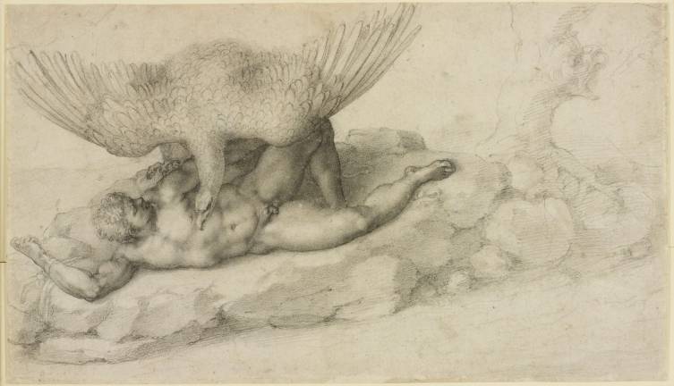When he was 57, he befriended Tommaso de’ Cavalieri, a much younger gentleman from Rome with a taste for antiquities. Beguiled by the young man’s learnedness, Michelangelo offered tokens of affection in the form of poetry and drawings based on myths from Ovid’s “Metamorphoses.” One black chalk sheet from Queen Elizabeth II’s Royal Collection, “Punishment of Tityos,” depicts the giant Tityos, nude and recumbent in the underworld, on the verge of having his liver bitten by a vulture for eternity, retribution for attempting to rape the goddess Leto.