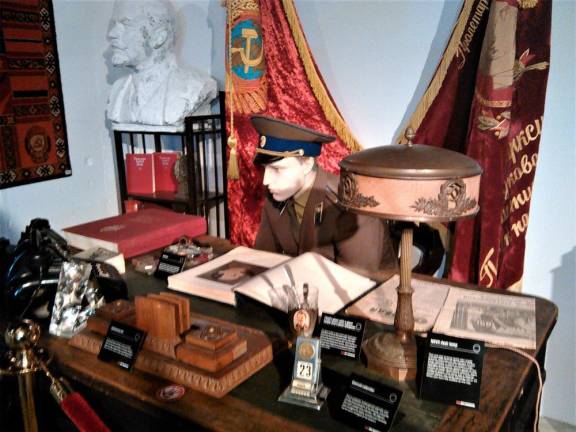 The world’s only KGB Espionage museum greets visitors with a “Lifestyles of the Communist and Fabulous” scene: a KGB officers’ desk, complete with decorative KGB lamp (supposedly owned by Stalin), a desk set, a silver tea set, a huge safe with a stash of rubles, and a high-end mahogany radio/record player that may have found its way to Comrade Stalin’s home.
