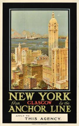 One of the earliest pieces in the show, an ode to Lower Manhattan’s skyscrapers featuring the now-demolished Singer Building, promotes service from Glasgow to New York by the Scottish shipping company, Anchor Line. Per the curator about this item from around 1910: “It’s rare. I had never seen it until I started researching this show. It’s an extraordinary architectural view that was almost certainly done from a photograph because of the precision of the rendering. It’s just exquisite. And this comes from a long-term poster geekiness, if I might say—-it’s wonderfully, wonderfully evocative.”