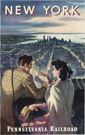 There are not a lot of people to be seen in these advertisements. The appeal is mainly in the architecture and the bright lights and big city streets, offering newbies adventure, escape and, yes, reinvention. In other words, a world of possibility. Lowry, a native New Yorker and poster appraiser for the PBS program, “Antiques Roadshow,” had the idea early on for an exhibit of New York City posters at Poster House, which opened in 2019. It became “a love letter to New York, a fifth year thank you to the great city,” he said in an interview.