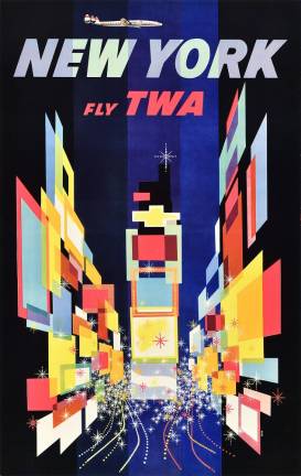 David Klein’s riotous, abstract distillation of Times Square for TWA from 1956 is one of the most famous posters of the city—so famous that it hangs in every guest room of the TWA Hotel at JFK Airport. Klein appears to be riffing on an earlier image of the Crossroads of the World from 1954, “Fly by BOAC/USA,” Lowry argues, but he takes it to the next level and turns it into “a masterpiece. [Klein’s work] has the trails of the cars, the abstract buildings, the abstract billboards, the hustle and bustle of the city and the bright lights. So it’s really trying to do the same thing. I like to say David Klein must have seen it.”