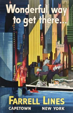 About half of the pieces on view are part of the museum’s permanent collection; the rest are on loan from Lowry’s clientele. Some of the items are quite rare. Head to the back right-hand corner of the exhibit space for one of Lowry’s favorite items, a daytime/nighttime view of Gotham by Frederick Siebel, circa 1951, for a small South African shipping company, Farrell Lines.