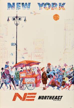 A tissue paper collage of Times Square, circa 1961, by Charles Robert Perrin for Northeast Airlines is also worth noting. A soft, somewhat blurry rendering, it’s notable for its crowd scene and two NYC perennials: