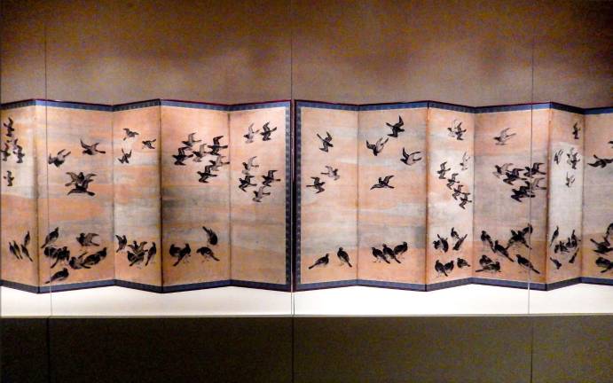 The exhibition fills several galleries with works that span from the 10th to the 21st centuries, though the focus is on the Edo period. From 1615 to 1868 Japanese artists came in contact with China and the West, finding new ways of seeing and creating. The Fishbein-Bender collection features those who broke from tradition. There’s a rare scroll by a 17th century female artist, Kiyohara Yukinobu. Her painting of waxwings, a small sparrow-like bird, may hold a secret message. The affectionate birds symbolized marital harmony; Yukinobu and her husband were both artists.