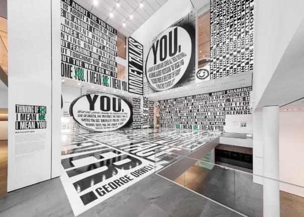 Kruger is the subject of three exhibitions at David Zwirner Galleries on 19th Street and a major installation at the Museum of Modern Art. “Thinking of You. I Mean Me. I Mean You” at MoMA wraps the viewer in a sea of texts. Larger than life words in dizzying, complex competition range from the banal to the curious to the profound. The Zwirner shows include video installations, sound art and digital re-conceptualizations of earlier works that combine texts and images, memes and metaphors, all set out to question societal constructs and sources of power – much of it more relevant that when it was made.