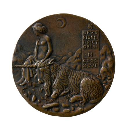 An inscription on the front announces the subject’s chastity: “Virgin Cecilia, daughter of Gianfrancesco I, Marquess of Mantua.” The back trumpets it with an allegorical image of a plucky female holding the horn of a unicorn, which, according to medieval lore, could only be tamed by a virgin. The disk slowly spins for 360-degree views.