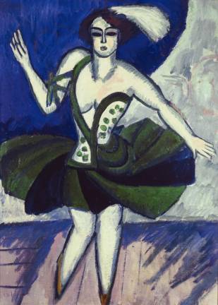 Colored electric stage lights brightened the theaters in Dresden and likely inspired the green floor and skin tones in “Panama Dancers” (1910-11) — the color produced by limelight, originally green light—and the pink-all-over performers in “Six Dancers” (1911).