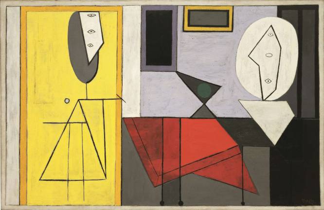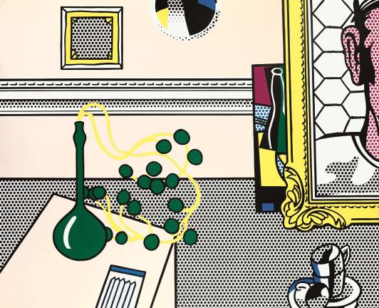 We also learn that a lot of what fills artists' studios is art, much of it by other artists. In Larry Rivers' “The Wall,” we find an upside-down signature of Matisse. Roy Lichtenstein references a head by Fernand Leger and Matisse's green bottle filled with nasturtium leaves in two paintings. Some artists are tidy and organized, others, less so. The controlled chaos in Rauschenberg's “Small Rebus” is chock-full of imagery, stamps, shreds of paper and other bits of the material of life. Yet, he arranges them into a masterful composition.