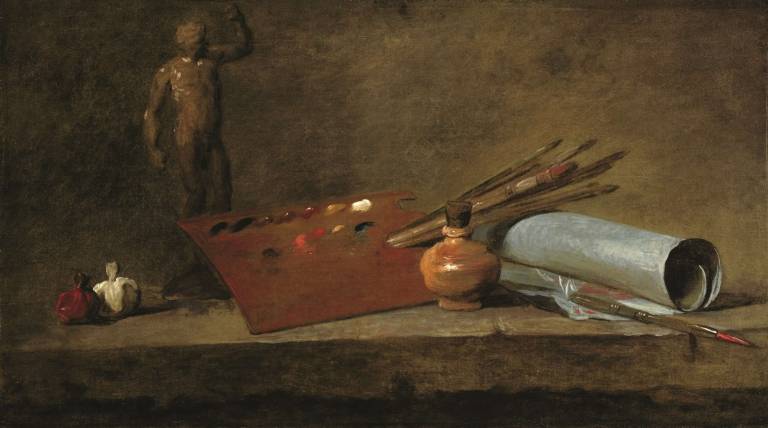 The exhibition broadens to include a focus on artists and their tools, with two beautiful still-life paintings by no less than Jean-Baptiste-Siméon Chardin depicting the tools of the trade: palettes, brushes, pots, paper, books and rulers. Later, we find the props artists use, with a glimpse into Diego Rivera's studio and his mindset. Papier-mâché models of fantastical figures and a voluptuous reclining woman crowd the space, while at the center, the model of a dove, which Elderfield explains is a reference to Rivera's recently deceased wife, Frida Kahlo, offers a point of stillness and light.