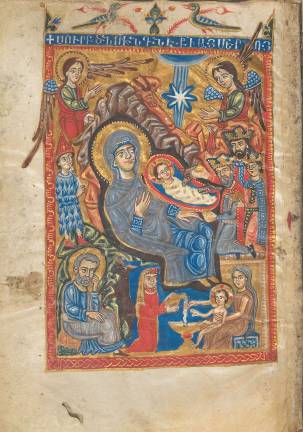 “I don’t think anybody needs any training to fall in love with these objects,” agreed Boehm. An illustrated page of the “Gospel Book of Queen Mariun” from 1346 depicts the Nativity as well as a much more everyday experience. “It’s a beautiful book that belonged to an Armenian queen, Queen Mariun, and we have it open to that page that shows the birth of Jesus. In one of those amazing medieval time travels, Queen Mariun, the owner of the book, the woman for whom the book was made, is present at the birth of Jesus.