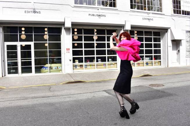 Trees are flaunting their blossoms and I’m voguing in wearable art by Engineered by Andrea T. at the Hauser & Wirth Editions 443 W. 18th St. This fantastical pink pouffe mocks the cherry blossoms, embellishing a slim black dress with Andrea’s trademark geometric details—in this case, triangular cut-outs at the shoulder. Goth platform boots balance the extravagant silhouette, which would have overpowered dainty heels.