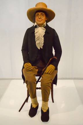 Some works are so strange they have to communicate with the viewer directly, since within the history of art they are totally without precedent or kin, like the “’Auto-Icon’ of Jeremy Bentham.” The English philosopher is presented fully dressed with a frilly shirt and a straw hat to keep out the sun. Beneath it all, embedded within the wax, is Bentham’s own complete skeleton.