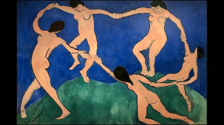 Visual alchemy like this is everywhere. The rich carmine of Matisse's "Red Studio" appears also in the adjacent painting by African American artist Alma Woodsey Thomas, "Fiery Sunset," done decades later. By doing away with chronological arrangements, the curators have opened questions about the reach of artists' influence as well as about whose stories get told. Vladimir Baranoff-Rossiné's sculpture "Symphony Number 1" from 1913, with curves and angles painted in red, blue and stripes, greets you as you enter gallery 505. It looks great in front of Fernand Léger's "Exit the Ballets Russes" from 1914. One is familiar, the other completely new to me.
