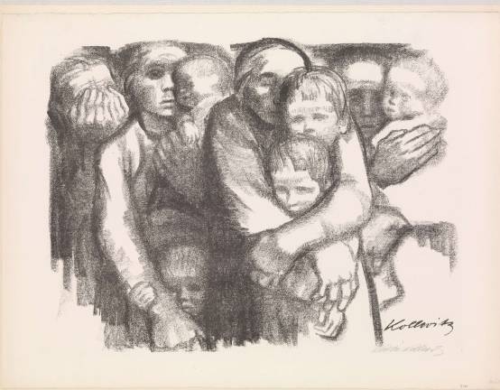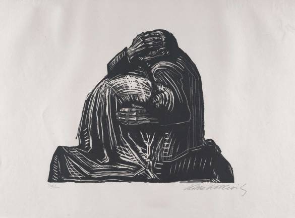 Kollwitz’s “Mothers” (1919), a lithograph from the same series, meanwhile pays special tribute to the maternal bond. A tight image of mournful mothers clutching youngsters, the piece features the artist at its center, huddling with her two sons.