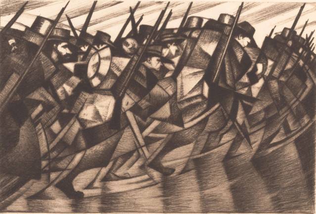 British painter-printmaker C.R.W. Nevinson (1889-1946), one of the most famous visual chroniclers of World War I, served as an ambulance driver and medical orderly before being appointed an official war artist in 1917. His prints are sprinkled throughout the show and are among the most haunting items here. He used Futurist and Cubist techniques to produce works that evoke the mechanical aspects of the conflict, the first truly modern war with airplanes, machine guns, tanks, poison gas and horrific casualties.