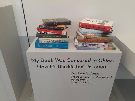 On display is also text that acknowledges the current tide of book bannings and rapidly escalating restrictions on free expression and speech worldwide.