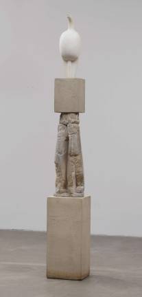 At MoMA, the avian sculptures soar. The stylized “Maiastra” (1910-12) is Brancusi’s first bird-themed work and opens the show. It was inspired by a Romanian folk tale about a magical bird and was likely influenced by Stravinsky’s “The Firebird,” which premiered in Paris in 1910. The regal marble rises seven feet in the air, topping a three-part pedestal that features a double caryatid sandwiched between two limestone blocks.