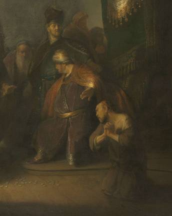 Judas has come begging for forgiveness for his kiss of betrayal and thrown the bribe money — 30 silver coins — to the floor of the temple. Look at the painting and count them. They glisten. The chief priest, flanked by elders, is disdainful of the gesture and uses his hand to repel the kneeling figure. Huygens captures the drama, writing, “that one maddened Judas … his gaze wild, his hair torn out by the roots, his garments rent, his arms contorted, his hands clenched until they bleed; a blind impulse has brought him to his knees, his whole body writhing in pitiful hideousness.” (Footnote: The grieving Judas later hangs himself for betraying Christ.)